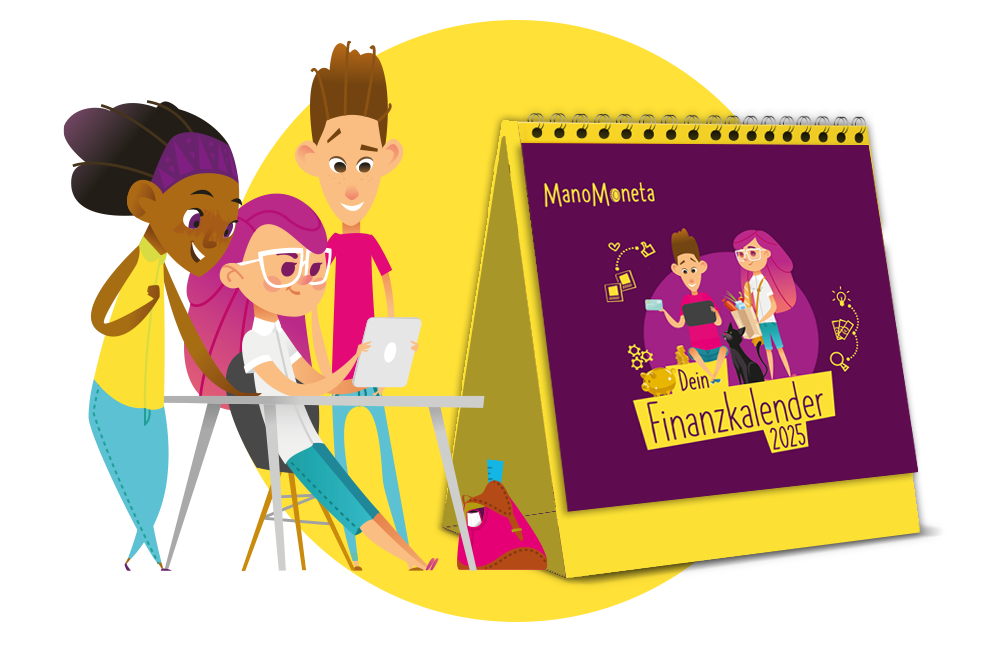 Mit hilfreichen Finanztipps und schönen Bildern rund um die Welt von Mia und Paul begleitet der ManoMoneta-Kalender Ihre Schüler*innen durchs Jahr. Bestellen Sie jetzt Ihren Klassensatz (max. 32 Kalender), solange der Vorrat reicht.