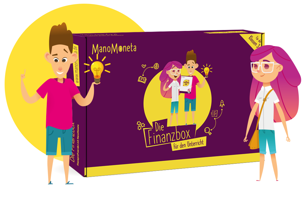 Die Finanzbox für Lehrkräfte enthält: 6 Unterrichtsideen, ein Finanzportfolio für Schüler*innen (als Muster), 48 Wissenskarten mit Finanzbegriffen und eine Anleitung für das Storytelling mit Spielfiguren.